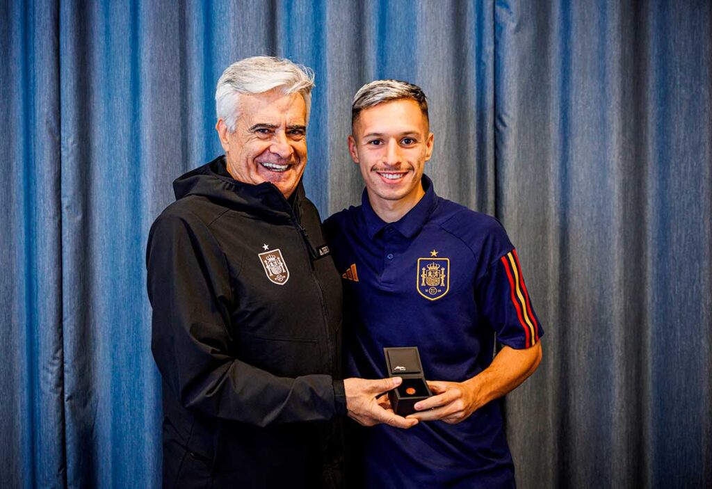 Pedro Rocha entrega a Bryan Zaragoza la insignia por debutar con la selección española de fútbol. Foto: Europa Press